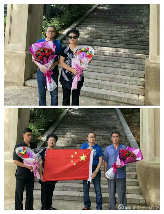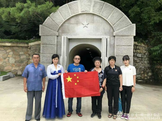 王大川一行在陵园前展示出了中国国旗,并与陪同的朝鲜同志合影留念。据红苍浩馆长介绍从建馆以来,今天是第二次见到拿中国国旗在这里祭奠烈士。