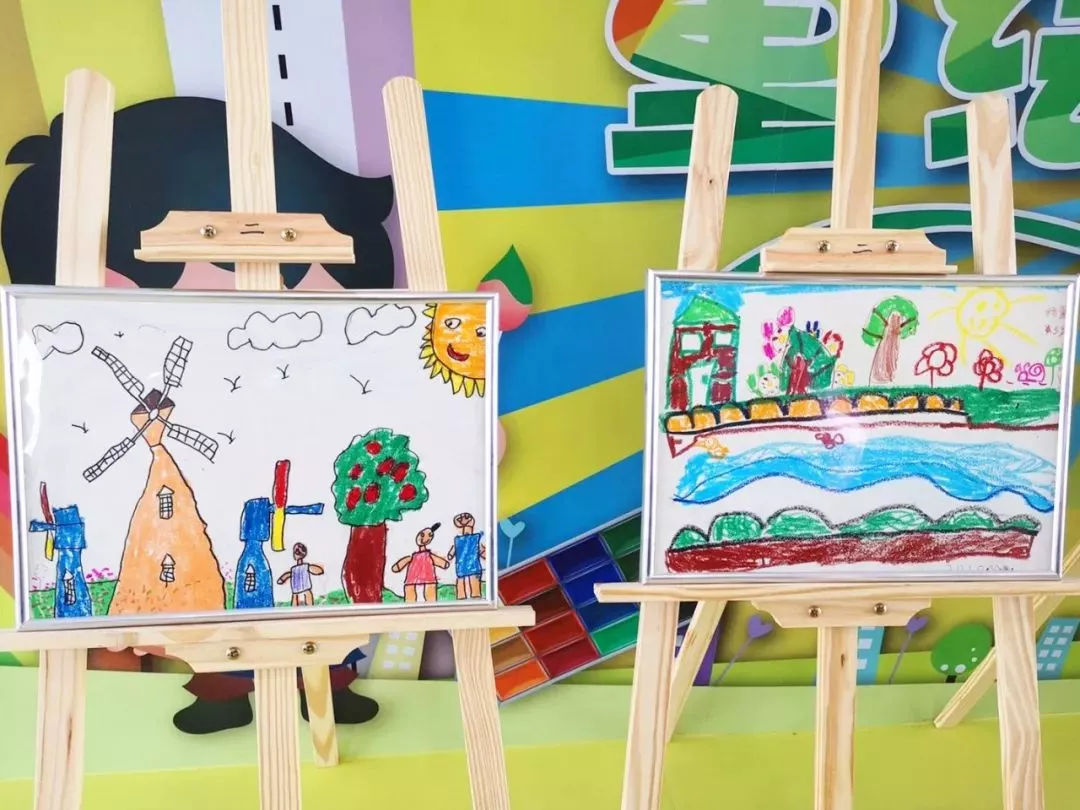 铅笔做框架,蜡笔上色,水彩画天空,大爱城建筑的线条在孩子们笔下有了不一样的表现形式;而奔跑在大爱生态农场里的小朋友,更是将花草树木、萌宠动物与秋收丰盛尽收画中。