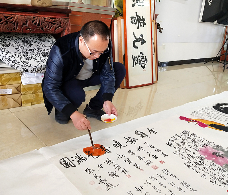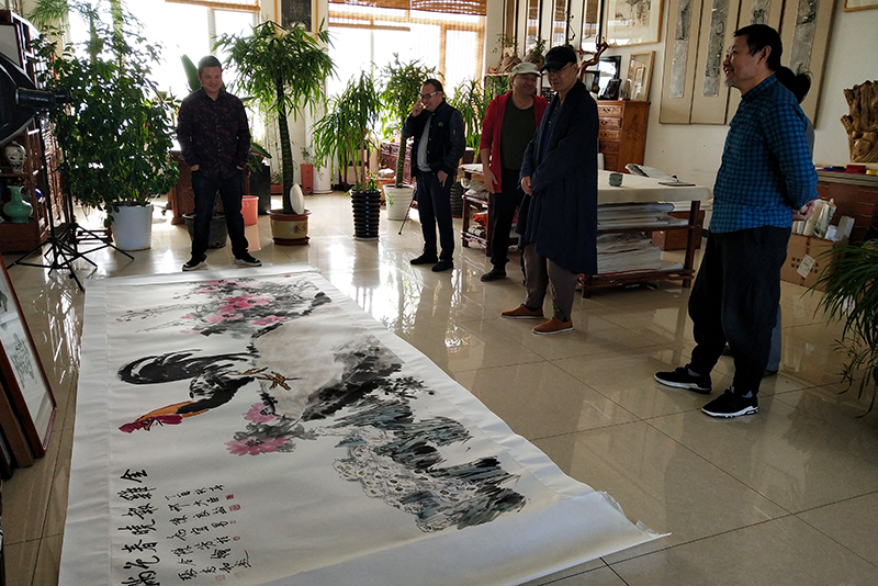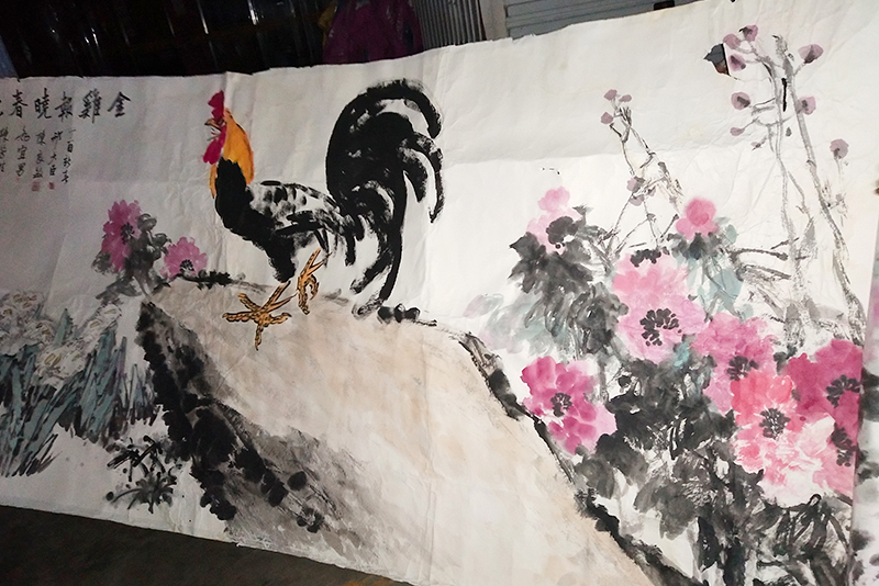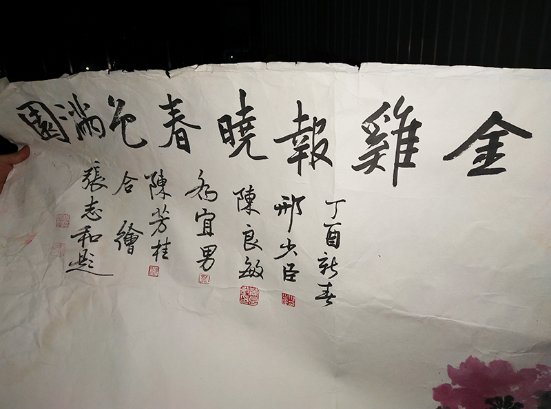 谈及此事,还得要从一个人说起,刘海博是一位具有多年收藏经验的资深书画藏家,说是藏家,不如说他是一位八零后的玩家,他为人低调,过眼画作不计其数,眼力独到,常被邀请为一些书画收藏机构鉴定,家藏也是数以万计,他自诩画如情人,对书画之情如痴如醉,常年游走于琉璃厂、潘家园、全国各大书画市场与各大拍场,甚至夜市、废品站都有他的身影,淘宝捡漏已成常态,我们经常在他的工作室看到惊喜。说起最近的一件趣事,就是他与新刚、一迈两位好友去大柳树的夜市淘宝,无意间看到一幅被多位买家拿起又放下的破旧大画,款为五位当代名家合作的丈二幅《金鸡报晓、春色满园》图,创作日期为丁酉年新春(2017),他当即判断这是一幅笔会合作真迹,但题款彷佛带有醉意,不如画的精彩,卖家只知名家,却不识真假,要价颇高,后经数轮谈判,以适价纳入囊中。