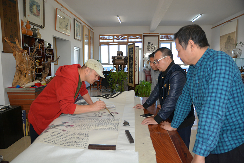 2018年10月10日上午,晴空万里,个山美术馆里竹雅兰香,群贤毕至,少长咸集,众书画家商议题写内容与位置,由青年画家谭永虹先生统一安排布局,后用抽签游戏的方式选择题写顺序与位置,顺应天意。
