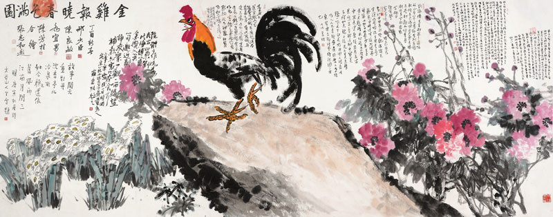 “刘海博先生收藏了这幅邢少臣等六画师合创《金鸡报晓,春色满园》之大画,意犹未尽,相邀几位书画朋友在空白处题字补白,使其丰富画境。增色,诗书画印,中国画之绝配。海博先生让此画增添古典书画气息,由此促成这次修画雅集之快事。此画,少臣先生画一大鸡,雄武地站立于画中,寓意健康强盛,花卉写景,应合吾国民间之审美;吉祥如意,锦上添花之美意。雄鸡一唱天下白,花好月圆人增寿,此乃人人之意愿。画道纷繁,人世沧桑。苦乐交错,修画雅记图一乐也。戊戌,金时”。