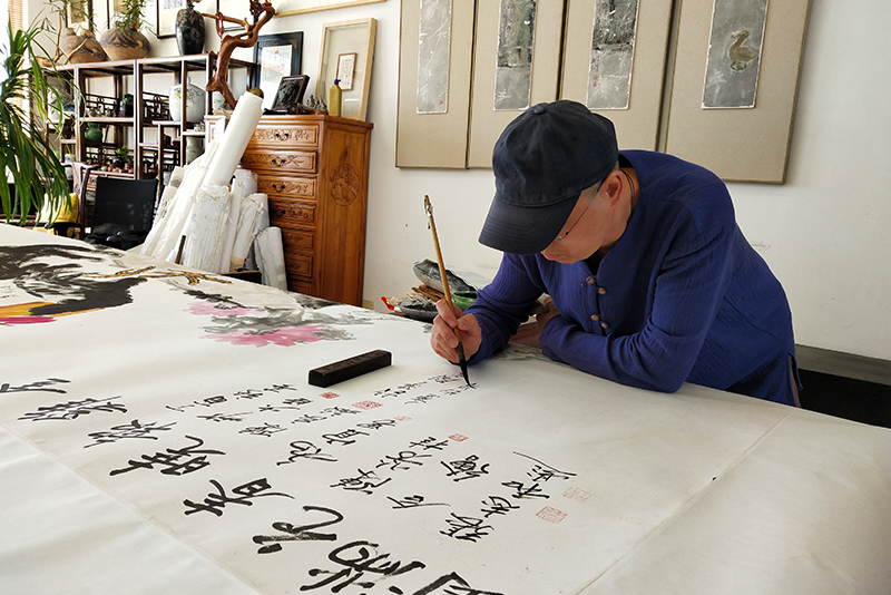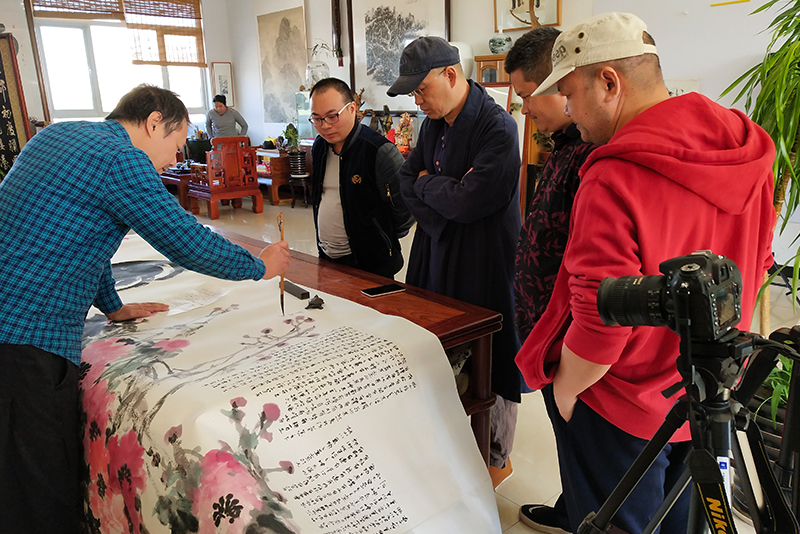 第一位是来自湖南的书画家余本海先生,余先生曾在清华美院进修书画专业,后来宋庄多年,醉心于书画、篆刻,皆为上品之作,只见他提一秃笔上阵,洋洋洒洒,一气呵成,选写四篇石涛画论于纸上,内容如下: