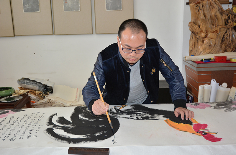 第三位是来自湖南的八零后画家谭永虹,毕业于湖南科大艺术学院,曾从事高考美术教育多年,后旅居宋庄多年,潜心研究书画,用功至深,才华横溢。先题跋于雄鸡上方,内容为自己的绘画心得: