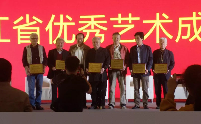 张蔚文主席同艺术成就奖获得者合影,自左向右依次为: 宋柏松、杜高杰、张蔚文、钱法成、钱贵荪、宋涛、郑竹三