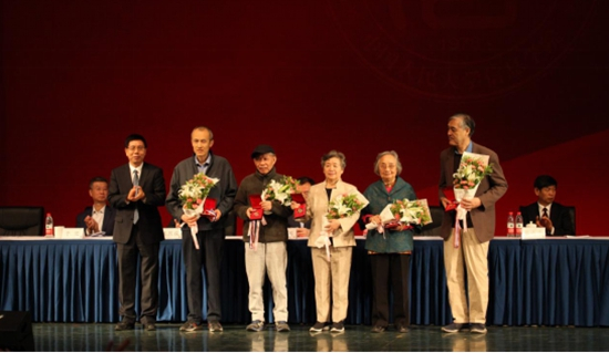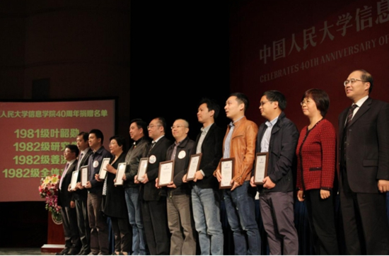 郑水泉为信息学院离退休教师代表陈禹、王珊、严守权、林颐、张道芳等颁发40周年纪念章,肯定了40年来信息学院全体教职工为学科发展和人才培养做出的重要贡献。