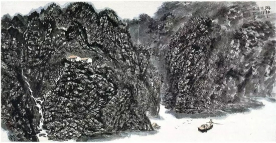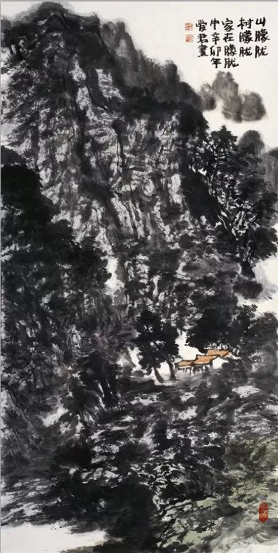 和爱君将审美的视角聚焦在自然与山水,自然与人的关系中,用自己独特的方式诠释着它们的存在。作品中深凝背景下的苍山秀水,与山间隐现的房屋和谐地交融在一起,蕴涵了“天人合一”的哲学理念。这种古典的美学思想深植在画家的灵魂深处,体现了中国文化的精神内核。庄子云:“有人,天也;有天,亦天也”,天与人本来就是世界统一的整体,人的自然本性就是投身于自然的怀抱中,获得心灵的宁静和恬淡,体验“天地与我并生,而万物与我为一”的超然之境。他所描绘的山水深邃高远,宏阔苍密,呈现出“天高地回, 接近中国画的本质。画家用如此丰富的语言表现变幻的山水图景,其根本是源于内心 觉宇宙之无穷”的博大气象。他对山水的认识不只停留在传统文人式的审美境界中,而是更注重对山水的精神探求,构建了自然与生命高度和谐的关系。他作品所呈现的不是文人山水的疏旷淡远,而是在繁缛中极富层次和秩序。这显然又带着明显的儒家思想的痕迹,强调周礼所铺陈的各种秩序。画家通过主观性的审美创造,融入了古典哲学的内蕴,使作品蕴涵了丰富的精神特质。