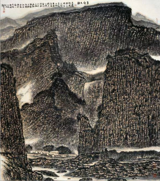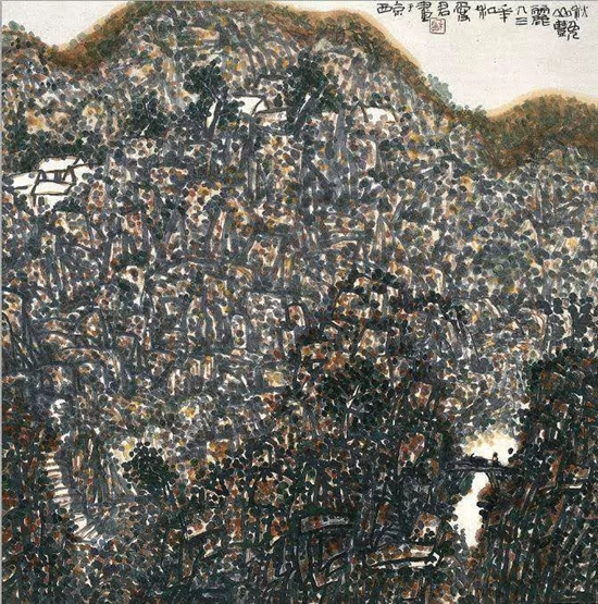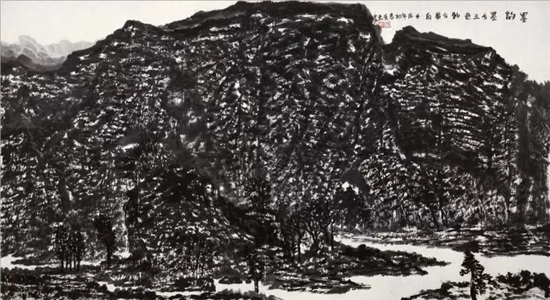 在多年的艺术实践中,和爱君不断丰富自己的绘画语言,不时地游离在具象和抽象、传统与现代之间,传递着画家对山水的别样理解。他的作品既体现出对中国传统水墨的尊重和眷恋,也融汇了西方绘画的技法形式,最终实现了中西的跨越和交融。由于画家对西方绘画体系的深入研究,使他在与中国画的融合上显得恰如其分。在以线墨为主的中国山水画中,画家将西画的肌理、体面、质感、色彩等元素,与中国画的线条、意境、内蕴等结合起来,构成具有西方样式又兼东方意趣的审美图式,在一定程度上代表了画家极为宽泛的学术认知。他的作品时而隐现着莫奈的朦胧光色,时而呈现出梵高的强烈视觉,画面氤氲着中西合璧的审美新风。 前期古典式的笔墨风格,转向符号性的新图式。笔下那些错落的山体,打破了传统山水皴擦点染的固有程式,演绎为点、线、墨的无限交集,或是各种几何形的变体。这种充满张力的笔墨结构,是建立在传统山水和西方绘画的精神层面上的,完全代表了画家对山水当代性的认知和领悟。如此繁密的堆积和延展,既突出了画家新颖独特的笔墨个性,又体现了自身对山水画理解的高度。他的作品不是对中西各家之风的临摹复制,而是将他们的内在精神化为自己笔墨的灵魂,用以撑起一片当代山水的崭新天地。在他的作品中,他甚至将山水画引入到科学的范畴,融入了更多的科学因素。他曾经以模块方式排列组合成山体,营造三维空间的山水之象。这种转化与创新不能简单地理解为审美形式上的蜕变,而是归结为画家内心的改变,是超前的审美意识在笔墨中的体现。近几年来,他的山水作品所含传统水墨的成 分日益递减,代之以更多新的理念和元素,使之呈现出强烈的时代气息,整体上极具现代感。