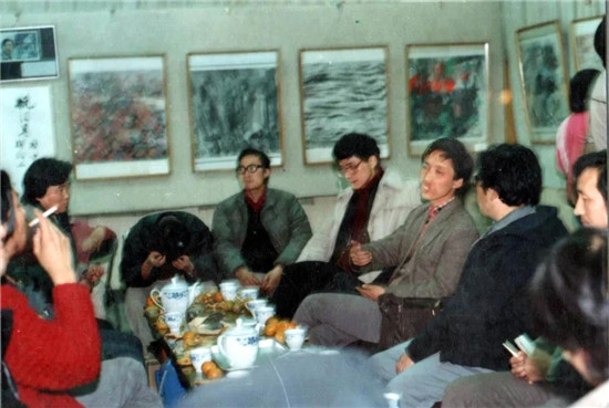 1988年,中国美术馆“杭法基现代水墨、拼贴画展 ”学术座谈会现场,与会者有批评家朱青生(左4) 刘晓路(左5) 顾丞峰(左6)等