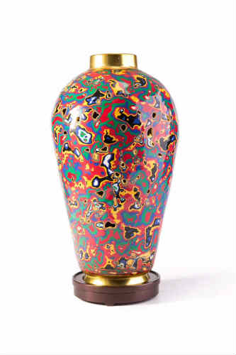 与传统的铜艺术品不同,铜瓶由朱炳仁大师独创的熔铜技艺,与庚彩相结合精制而成。瓶身星星点点覆盖着五彩缤纷的彩料,如宇宙绚烂的星云一般如梦如幻,又如枝头朵朵鲜花在瓶身绽放。庚彩技艺借鉴了传统的五彩、珐琅彩、粉彩的手法,工艺极为复杂,对制作工艺的要求很高。通过熟练匠人的手工高温着色,通过彩料的渗化、迭加、融汇、渲染、抛磨、熔炼,不不仅葆有了了金属的晶莹质感,色彩却比传统的铜质艺术品更为瑰丽多姿,浓艳夺目。