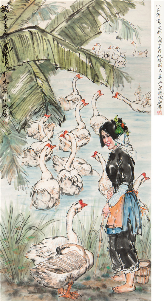 本场最大亮点是黄胄的《牧鹅图》,尺幅较大,体现出黄胄先生扎实的写生与素描功底,图中鹅的造型准确生动,鹅淋漓尽致,人物神态与肢体语言更是描绘的栩栩如生。鹅与池塘形成了一幅乡间悠闲自在的景象,怡然自得的气氛跃然纸上,画面给人以无尽的遐想,形成色彩对比,画面和谐而多姿,构图饱满而丰富。