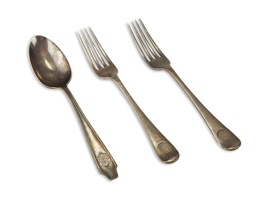 此套餐具包括两件银叉及一把餐勺。致远舰由英国公司设计建造,配备的全套餐具,也是由英国皇室使用的品牌韦奇伍德(Wedgwood)特别定制。每件餐具把柄均有“致远”二字篆书的圆形合体。围绕着圆形合体还可看到英文“THEIMPERIALCHINESENAVY”(中国皇家海军)的字样,以及“致远”的威妥玛拼音。此三件餐具制作精良,且为传世致远舰遗物,其价值无法估量!