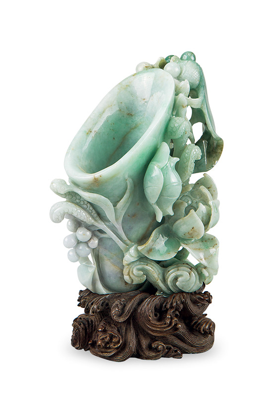 此花插为翡翠质地,圆雕一整颗白菜,菜叶碧绿,叶片肥硕,中部有一圆形孔,以供插花。下配以海水江崖为纹式的红木座。整体线条简洁流畅,采用了螺旋式曲线雕琢,造型煞是玲珑可爱,打磨细致入微,非同一般花插所能比拟,令人爱不释手,是书房案头之雅物。