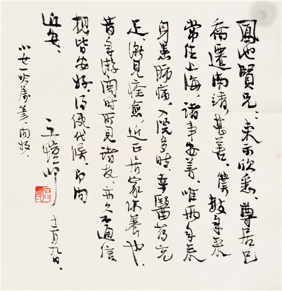 释文:凤池贤兄:来示欣悉。尊居已乔迁南靖,甚善。仆数年来常住上海,诸事安善,唯两年来身患肺病,入院多时。幸医药充足,渐见痊愈,近正居家修养也。昔年游闽时所见诸友,亦久不通信,想皆安好。得便代候。即问,近安。