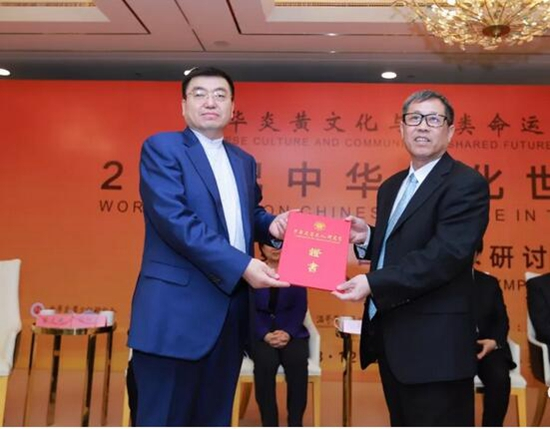 常文光向中华炎黄文化研究会海外拜祖委员会会长郭彦增颁发《分支机构证书》