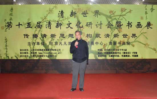 2018年11月10日下午,“清新世界”第十五届清新文化研讨会暨书画展在北京举行。本次活动是由北京凡凡清新文化发展中心、清新书画院等单位主办,北京环球博威国际展览有限公司协办的文化盛会。通过开展学术研讨、书画展、书画笔会等活动,传播清新思想,弘扬清新风气,提升清新格调,展示当代杰出中国书画家和艺术家对清新风格的追求及其艺术成就和创新成果,体现了他们弘扬优秀传统文化、弘扬正气的社会担当责任。
