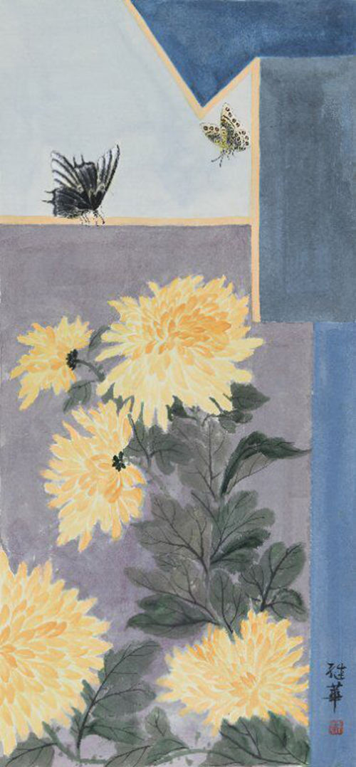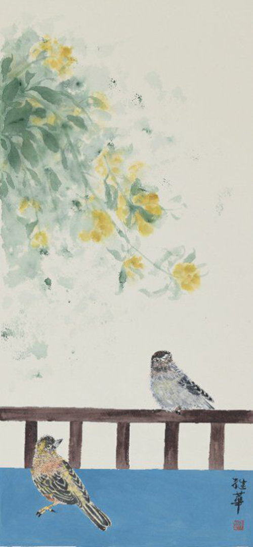 张继华又是个喜欢恬淡生活的人,而艺术家的敏锐直觉和洞察力,让她不由自主的用画笔去记录、去宣泄,用艺术这种特殊的表现形式,去完成一种超越人本并升华到精神世界的回归。除了画“兰”外,张继华也以“梅”、“菊”、“竹”来寄托自己的情感,来充实自己的灵魂,来写自己的风骨。她将自然界中各种花卉、禽鸟作为自己的情感的宣泄载体,且在每幅作品中都配以人们喜爱的禽鸟,使作品凸显出人与自然的和谐之美,洋溢着积极向上的美好旋律。