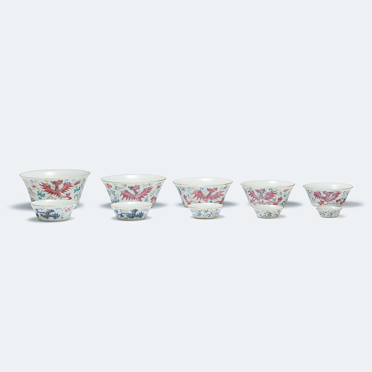 LOT 8006清中期 粉彩夔凤纹套杯(全套十只、带原配布垫)