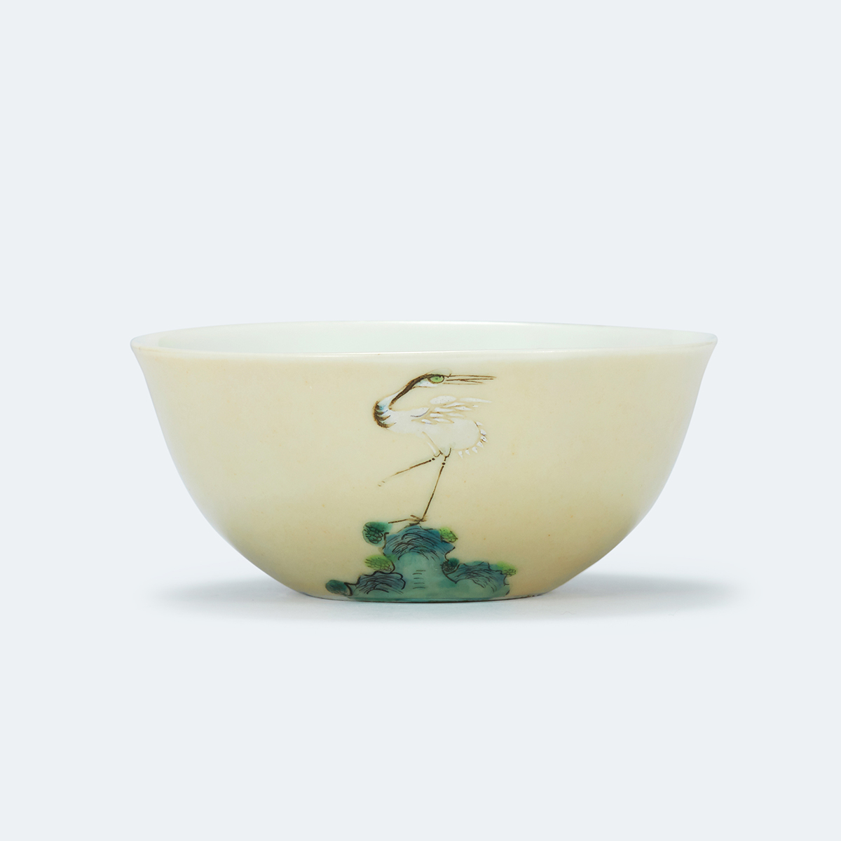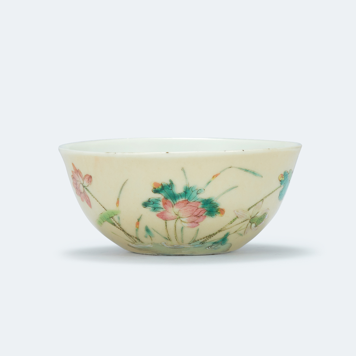 LOT 8005清 道光 米黄地粉彩莲鹤纹卧足碗