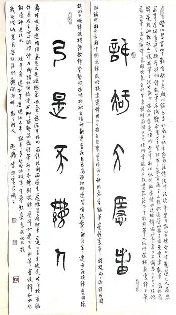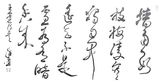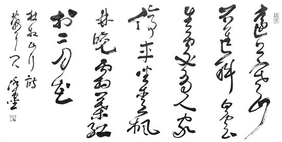 艺术创作的更新不止于书法风格的思考,更在于以实践性的探索开拓书体艺术的深奥。李徐灵先生历经数载之久的艰辛努力,从形式上,将狂草与章草有机的结合起来,改变以往数字或整行的蛇型连接,形成了字断意连表现手法。线性上,从扎实枯润的圆转遒劲,向凝重沉着转折并用发展。字势也从左低右高的楷书创作嫁接到左右平直或右边略低的隶书方法变化。