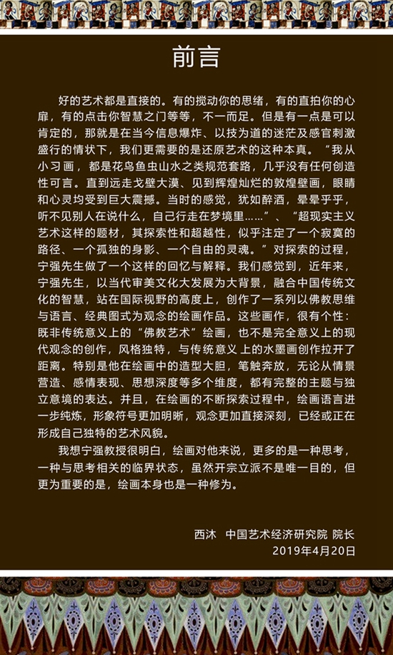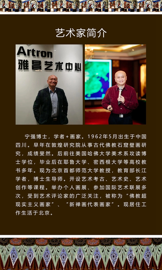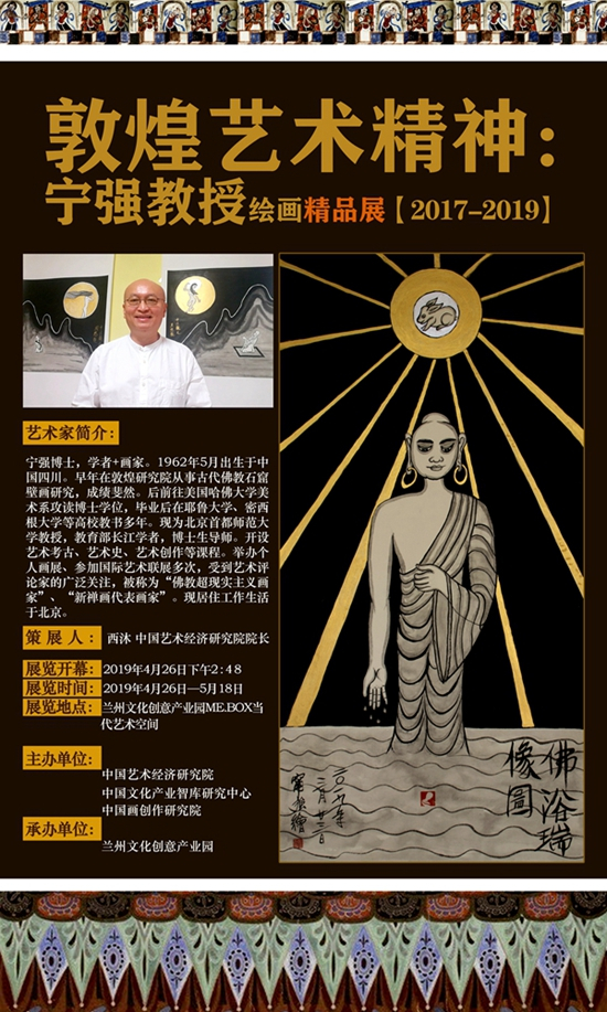 宁强先生是国际著名敦煌艺术学者、教育部长江学者、首都师范大学博士生导师,其佛教超现实主义绘画成果的两次艺术展,从不同侧面反映了宁强教授数十年深研敦煌艺术生态、表现敦煌艺术魅力、传播敦煌艺术精神的真实写照。如果说“反弹琵琶主题展”另类地诠释了敦煌艺术文化在古与今、东与西、传统与现代之间,成功的演绎了“佛教超现实主义绘画”前世今生的敦煌时代表情,那么本次“敦煌艺术精神·宁强教授绘画精品展”重返河西走廊,并在首届中国艺术经济高峰论坛举办之际开展,不言而喻地展呈着宁强先生国际艺术史背景的艺术创作理念携带着传统文化遗产不断生发,丰富敦煌艺术在一带一路文明沿途对流多维艺术前沿思想碰撞洗礼后的精神还乡。