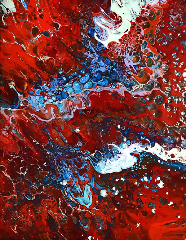 田画家的每一幅油画,尤其是抽象油画,都是直接从天堂复制下来的彩色天花板。因为天堂就是抽象之物,只能在美丽心灵中显现。那么,她的这幅抽象油画《火山与蓝钻》,正是一首赞美诗,名字可以叫做“天堂礼赞”,又是一首抒情的乐曲,名字应该叫“天使飞翔”。看呀,画面中的天使舒展硕大的翅膀,翅膀上长着火红火红的红羽毛……那么,镶嵌在“红羽毛”上,或散落在“红地毯”上的一颗又一颗晶莹剔透的蓝钻呢,作为矿物质,它们可不是天上的陨石啊,反而是地球深处——地幔的产物,随着火山喷发而与人类为伴。