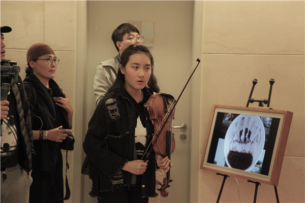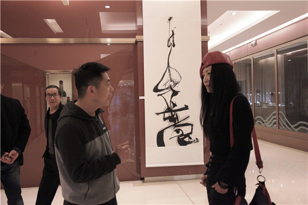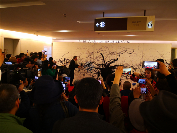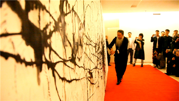 开幕现场,邵岩即兴表演了射墨行为艺术,十分钟时间,在小提琴手高山流水悠扬旋律伴奏下,创作了巨幅《黑洞》射墨作品,受到与会观众的好评。