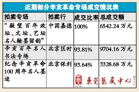 书画市场大掀“辛亥革命热”,中国嘉德、北京保利、北京匡时等拍卖行推出的辛亥革命专场频频以接近100%的比率成交。不过有市场行家担忧:会不会有无名小卒趁此“鸡犬升天”会不会假货乘机肆意横流?