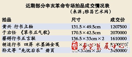 作为辛亥革命核心人物孙中山的书法,作品动辄过百万元;此前成交价格不过2万~3万元的徐世昌书法,最近成交价却可达到20万元以上;曾大力支持辛亥革命的广东籍华侨郑洪年,其作品按市场行情不过1万元左右,近日却能拍出超过4万元价格!