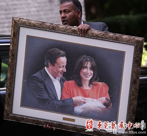 这张合影摄于去年8月,当时卡梅伦夫妇在唐宁街10号的台阶上将刚出生的小女儿佛罗伦萨介绍给外界认识。有人批评说在电脑的帮助下,这种自照片临摹的油画只需一天就可以制作出来。还有人打趣卡梅伦收到这份礼物后的反应:定会为把这份“贵礼”挂在哪儿而发愁,说不定会把它挂在楼下的洗手间里。