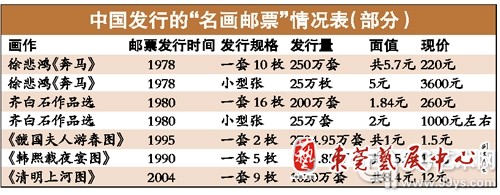 据了解,徐悲鸿的《奔马》在1978年登上邮票发行,一套10枚,面值共5.7元,而目前市场价格为220元,32年来涨了40倍;同时发行的《奔马》小型张面值5元,多年来价格从几元到几百元、1000多元,目前甚至高达3600元!