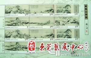 《富春山居图》是元代名家黄公望的作品。此次发行的以该画为内容的《富春山居图》特种邮票一套六枚,采用连印版,邮票规格是60×30mm,其中四枚价格均为1.2元,一枚1.50元,一枚3元,面值共9.3元。实际上,像《富春山居图》这样的名画邮票并不少见。