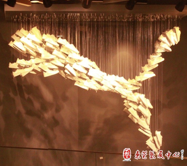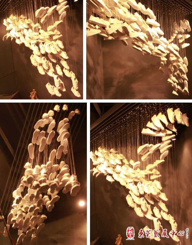 最后整个装置的搭建工作由新茶的实施团队(Taylor Shen是制作人)花了5天的时间完成。首先在每一层挂上印有鞋子角度和位置的模版,再根据这些模版上每只鞋的位置和角度精确得挂放,以保证最后呈现出得3D效果。