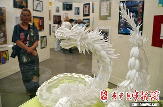 当地时间8月23日,美国拉古娜艺术节在橙县海滨城市拉古娜举行。当日举办了用生活垃圾制造的时装和艺术品展览与说明会。图为一名参观者观看用废弃的一次性塑料叉子和勺子制作的“盘龙”。中新社发 毛建军 摄
