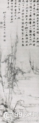 万上遴的画,是一幅模仿倪云林的《龙门僧图》,题跋上这么写道: