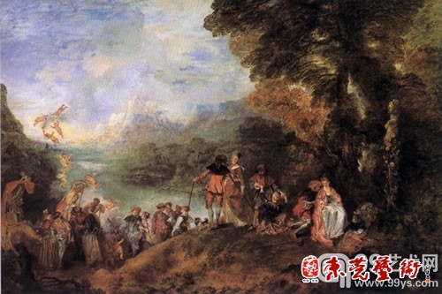 在西方绘画史上,华托以空灵的田园风格表现出18世纪贵族生活“雅集”(fetes galanntes)。他在美丽的风景和府院中描绘出华服男女之间谈情说爱、演奏音乐、举办舞会等梦幻与现实相交融的抒情场面,其灵感来自当时他所生活的巴黎。