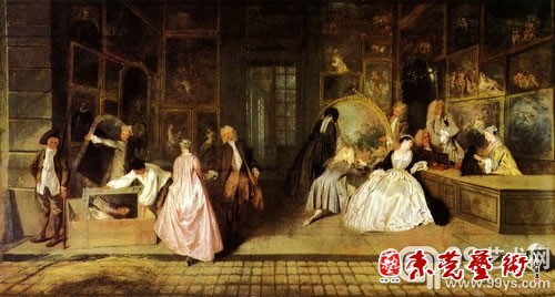 事实上,华托的代表作《热尔森画店》足以证明,他已经超越了鲁本斯等前辈大师。人们从华托非凡的技巧中看到法国绘画艺术的新方向——画面中人物形体之间的节奏与韵律,光与色之间的微妙变化,都为法国乃至欧洲的画家开辟了一条宽阔的新路。在他的画中,不同阶层的巴黎人都能在画中看到自己,看到他们的生活与时代。“他的‘雅集’成为人们对城市生活的一种梦想和顶礼膜拜,其画面笼罩着的人生和爱情虚幻而脆弱的气氛,令人感到惆怅。”希尔顿认为,华托作为洛可可风格的杰出代表,被后世的画家们竞相效仿,但始终无人能模仿他华丽笔触背后的忧郁精神世界。