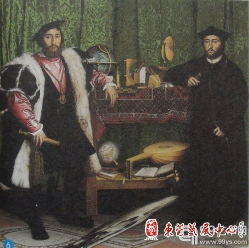 (一)德国画家荷尔拜因的一副画曾给我留下非常奇特的印象,那就是他创作于1533年的《使节》。这幅等身大小的双人肖像,左边是当时的法国驻伦敦大使丹德威尔,右边是赛鲁威主教。两人中间的静物体现着他们在音乐、天文、地理方面的博学,还有一本路德教派赞美诗。与普通肖像画不同的是,画面左下角出人意外地插入一个拉扁的骷髅头骨,像一把长剑,又似一条鲨鱼。只有当观众站在画面的侧方,这个突兀怪异的图形才会变成一个比例适中的头骨,让我们在平静中感到不安与不祥。这正是作者利用不同维度空间在同一画面上的共生所达到的艺术效果。《使节》在古典画中是一幅极具前卫与前瞻性的作品。