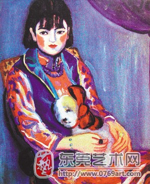 置身于城市环境中的部分女艺术家,如关紫兰、丘堤、杨荫芳、曾奕等,也受这种潮流影响,将平面的、抽象的、色彩绚烂的带装饰意味的表现主义笔法引进自画像中。其中,关紫兰(1903-1986)是最有代表性的一位。关紫兰的绘画风格奠基于中华艺大学生时代,成型于她的日本留学时期。那种粗线条、大笔触、平面简洁的构图,浓重明快、对比强烈的色彩,强调瞬间印象却不刻意追求形象的体积感、明暗感、透视感诸效果的风格,明显带有印象派、野兽派的特点,而画面的清新、悦目、富有装饰性,色彩的斑斓、华丽,人物形象洋娃娃式的甜美、时尚,又与她作为一名城市摩登女子的心理诉求相关联。关紫兰才貌双全,美貌和高贵气质使她成为《良友》画报的一个“卖点”。在媒体的推介下,她成为当时引领艺术和生活新潮流的一颗艺术新星。社会的宠爱和期待,对她画风的形成,不无影响。她以画女子肖像为擅长,现存的有《弹曼陀铃琴的少女》、《悠闲》、《秋水伊人》、《L女士像》、《绿衣少女》、《肖像(白描)》等。不同的画面,画的是同一个人物,那个大眼睛、短卷发、结着头花、戴着串珠项链、身着衣裙的美丽少女,正是画家本人。《L女士像》是她的代表作。少女怀抱洋布狗,红花条纹蓝镶边长袖旗袍,外套蓝色背心,脸上涂着鲜红的胭脂,洋娃娃似,精致而优雅。她的肖像画带有浓重的现代城市气息:平面的,装饰性的,摩登衣物自炫的,唯美情调的,而现代笔法的介入——野兽派狂放、粗率的笔触,浓重的色彩,表现主义的平面构图等,又使画面的唯美渲染没有流于“月份牌女郎”式的甜腻、清浅,而是超越世俗形态,突出画者瞬间的感官印象,以大轮廓勾勒形成画面的形式感:变形的形态、流动的色彩、对称或不对称的图案感等。她成功地将现代主义笔法融入自画像创作中,推出一个受现代生活方式浸染的城市女性的新形象,她的画面具有现代意味。