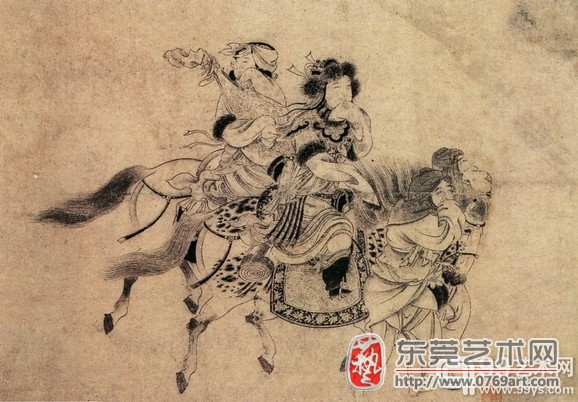 金朝的宫素然是有作品传世的第一位古代女画家。她以白描人物画见长,创作有《明妃出塞图》。这是一幅人物长卷,描绘的是王昭君出塞和亲途中的景象。画作简洁,没有树木山川等背景;但空间感和层次感极好,尤其是人物情态的刻画真实生动。画面中,朔风正厉,飞沙扑面,诸人缩颈弓身躲避风沙,连马也低首缓行;唯独视觉中心处的王昭君神态从容,她左手上举置于颔下,凝眸回首,不舍之情尽在不言中。它是现今留存下来的唯一一件宫素然的遗墨,它于清朝年间流入日本,现藏于日本大阪市立美术馆。