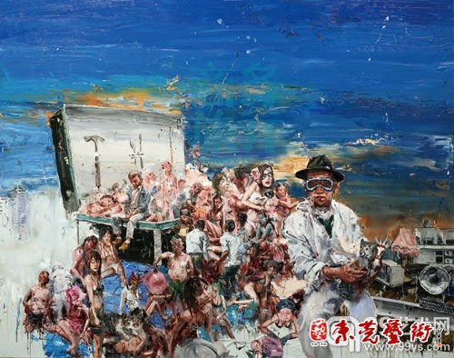 屠宏涛利用一个舞台,或一个舞台化的场景来透视城市现实,其中杂陈的形象与密集的细节对应着我们光怪陆离的都市生活,更表征着浮华背后的心理感受。