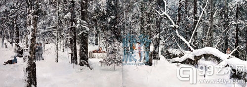 作为70后艺术家里的代表人物,屠宏涛以其出色的语言才能向我展示了他们那一代人特定的生存经验和人生感悟:困惑、怀疑,对世界充满好奇,在放纵和禁欲之间摇摆不定。在他创作于2007年的《雪林》中,神秘寒冷的密林深处尽管仍然充满了伤害感,但却出现了火的意象,似乎暗示着某种东西正在回暖,正在试图和这个世界达成交流与和解。