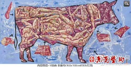 值得注意的是,自2006年以来,江海的关注点从工业产品又转向自然界的动植物,在其画面中,经常出现节肢动物与昆虫,呈现出人与动物的重构关系。在这一过程中,我们可以感受到美国好莱坞灾难片中人与动物的关系,从中引申出人与自然的关系。由此,江海发展出近期创作中一种特殊的图像构成方式,即在他的作品中所出现的“双重形象的组合”——即由人体组成其它的自然界形象或工业产品。在江海的作品中,人与牛、猪、昆虫、直升飞机等,都可以合成形象。这样,我们在江海的作品中,看到不变中的变化,变化中的不变。可以说,江海始终关注人的本身,他的作品,提示了一种“祼人”的创作意念,这种意念恰恰对应着现代生活中“人”的日益隐匿,不仅是人们隐匿自己的真实形象和真实想法,也是隐匿着人性的本质。从而通过2007年的《视域的边缘》系列,达到了2008年以来的《物的形态》系列,“人”的消逝与“物”的突显成为我们时代的主导旋律。