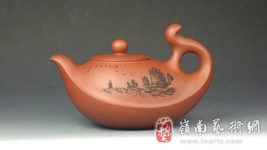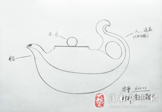 张九龄一句“海上生明月,天涯共此时”,汪成琼用紫砂艺术诠释对这首诗的理解,描写出千年之前月明星空,波澜壮阔的海上景象。壶身呈航船造型,壶钮为日月,提梁为篆书“人”字形,寓意“海上丝绸之路”,人在大海中日夜航行。乘长风,驾巨浪,一叶中流任奔放,更描绘出海上丝绸之路商船竞发、东西方文明交流融合的繁华。