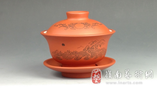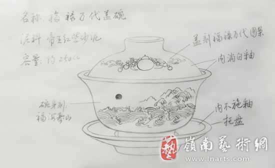 传统式,盖为天、托为地、碗为人,暗含天地人和之意。碗身雕刻福山寿海图,象征大江大河、波涛翻滚海浪,江山如此多娇;碗盖配以福禄(葫芦)图,五个葫芦与绸带、藤蔓缠绕,寓意福通五洲、和谐共融。