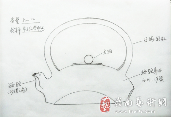 王维的诗句“大漠孤烟直,长河落日圆”,勾勒出一幅塞外风光。此壶“天圆地方”,提梁宛若苍穹,寓意万物通达,天人合一;壶嘴与壶身为沙漠之舟,壶钮比作太阳,提梁喻为驮载的丝绸,寓意陆上丝绸之路。骆驼在沙漠中像凌波劈涛的航船,接受人类的使命,用坚毅的脚掌踏出了一条连接欧亚的“丝绸之路”,还蕴育出了以“胡汉”相融为特色的汉唐文化。