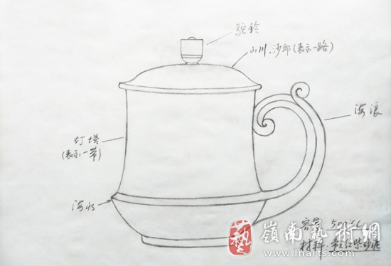 将丝绸之路经济带和海上丝绸之路的元素相融合,对一带一路最完美的诠释,也是对这一宏伟战略的高度致敬。杯钮设计成驼铃,盖身比作沙丘,驼铃阵阵,羌笛悠扬,丝绸之路跨越无垠的戈壁;杯身代表灯塔,足底比作海水,杯把呈泛起的海浪,寓意先辈们日夜在海上乘风破浪,不畏风雨打开一条海上丝绸经济带。