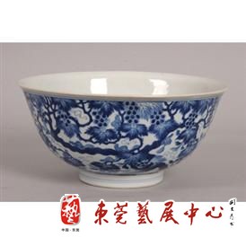 撇口,深腹,矮圈足。外腹绘数只形态逼真的小松鼠玩耍、跳跃于果实累累的葡萄树之间,构成了一幅生机勃勃的画面。青花用色纯正,胎体细结。底有青花“大清乾隆年制”篆书款。
