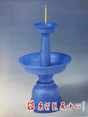 蓝玻璃刻花蜡台(清乾隆)通高28.5厘米,盘径6厘米,故宫博物院藏。