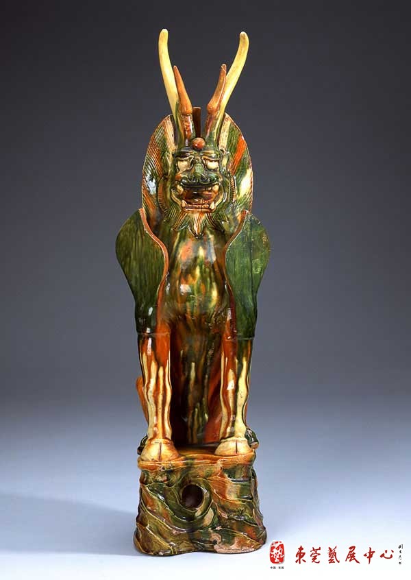 这只镇墓兽蹲踞于台座上,形相诡异:头长双角,瞪目,巨口獠牙,络腮胡,肩生双翼,长腿蹄足。通体施黄、绿、白三彩釉,各种釉色互相交融,形成斑烂淋漓的效果。