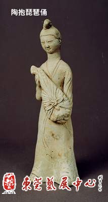 唐,通高27厘米。白陶。女俑头挽高髻,嘴带微笑,面部丰满,眉目清秀。小袖紧身长裙曳地,微露尖头履,双手抱用包袱包裹着的瑟琶于胸前,比例匀称,造型优美,体态轻盈婀娜,呈现出女性端庄柔美的曲线美。作者通过面部的刻画,惟妙惟肖地刻画出女性的内心世界,表现出她欲行还止,颦笑俱全的意志及脸带稚气又故作矜持的表情,整个作品洋溢着青春之美和生命活力。